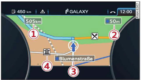 Audi Q7 - Bedienungsanleitung: Kartenansicht bei gestarteter Zielführung