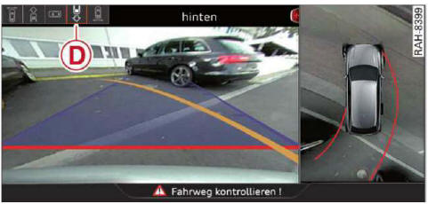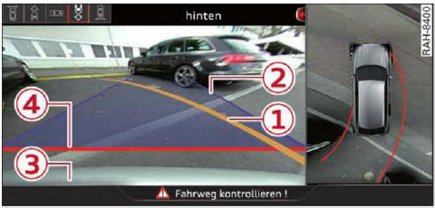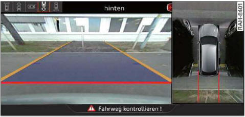 Die Genauigkeit der Orientierungslinien und blauen Flächen nimmt ab, wenn die Luftfederung* defekt ist, das Fahrzeug angehoben oder die Heckabsenkung aktiv ist oder der Modus dynamic, allroad* bzw. lift / offroad* eingestellt ist .