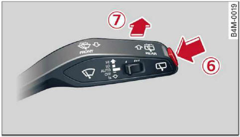 Sobald der Rückwärtsgang eingelegt wird und zugleich der vordere Scheibenwischer eingeschaltet und in Betrieb ist, schaltet sich automatisch der hintere Scheibenwischer mit ein.