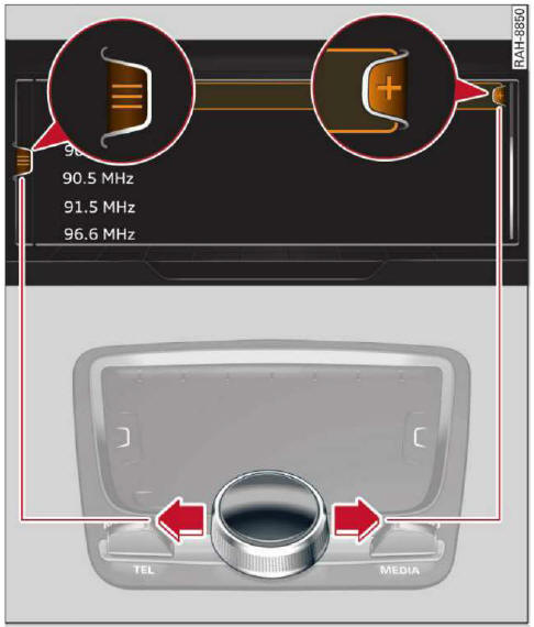 Voraussetzung: Im Infotainment-Display wird das Symbol für das Auswahlmenü angezeigt Abb. 225.