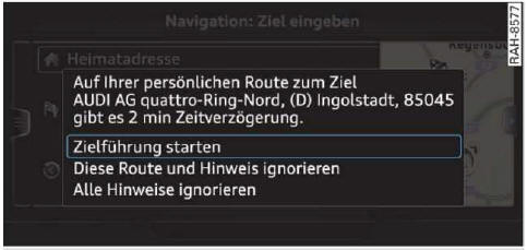 Bei größeren Verkehrsstörungen (mehr als 7 min. Verzögerung) wird Ihnen, unabhängig vom gewählten Menü, ein Hinweis angezeigt Abb. 251. Wählen und bestätigen Sie eine der folgenden Optionen: