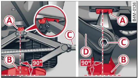 â–º Stellen Sie den Wagenheber* (Bordwerkzeug) auf einen festen Untergrund. Benutzen