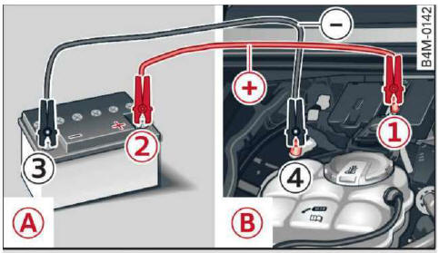 - Falls Sie einem anderen Fahrzeug Starthilfe gewähren, verlegen Sie die Starthilfekabel
