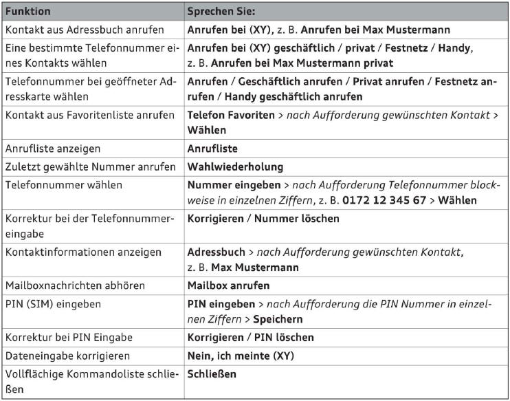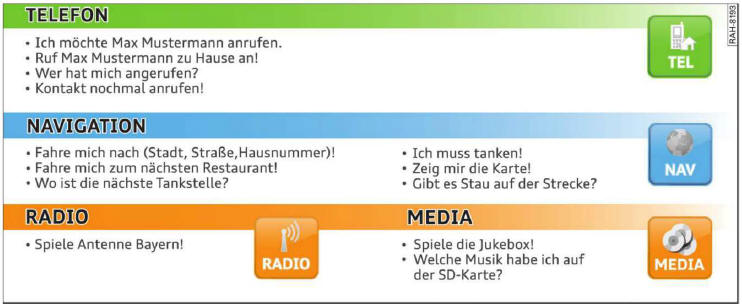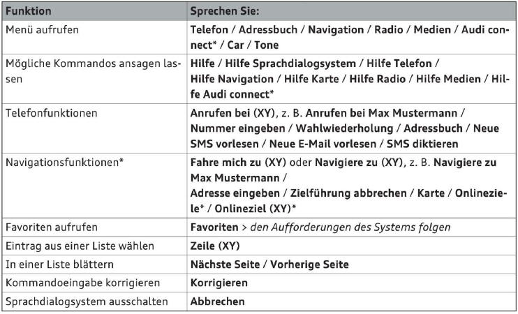 Die folgende Übersicht bildet eine Auswohl on Kommandos ab, die es Ihnen ermöglichen, auf natürliche Weise mit Ihrem Fahrzeug zu sprechen.