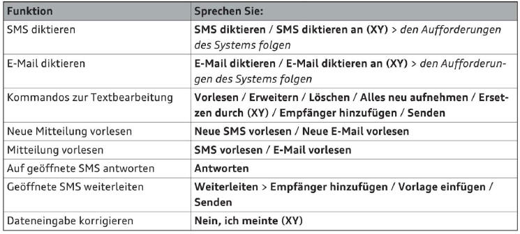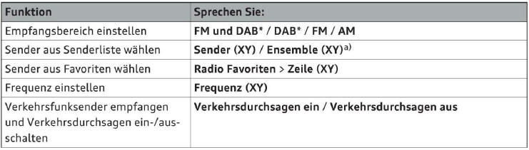 Abhängig von der Fahrzeugausstattung und vom gewählten Empfangsbereich, können Sie folgende Kommandos sprechen: