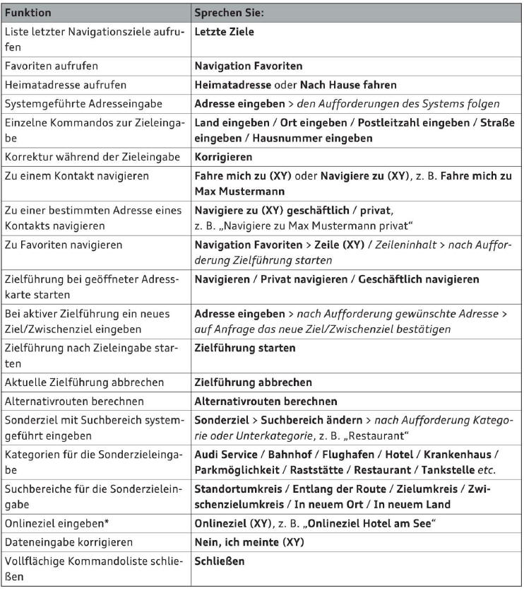 Abhängig von der Fahrzeugausstattung und vom gewählten Menüpunkt, können Sie folgende Kommandos zur Zieleingabe sprechen: