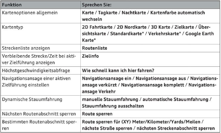 Voraussetzung: Sie befinden sich im Menü Nävigation bzw. Karte. Abhängig von der Fahrzeug ausstattung und vom gewählten Menüpunkt können Sie folgende Kommandos für weitere Einstellungen in der Navigation sprechen: