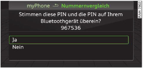 ► Geben Sie die PIN für den Verbindungsaufbau auf Ihrem Mobiltelefon ein. Oder: Wenn die PIN auf Ihrem Mobiltelefon angezeigt wird, bestätigen Sie die PIN auf Ihrem Mobiltelefon und im MMI. Die Eingabezeit der PIN ist auf etwa 30 Sekunden beschränkt.