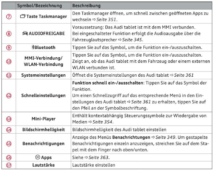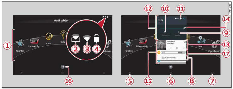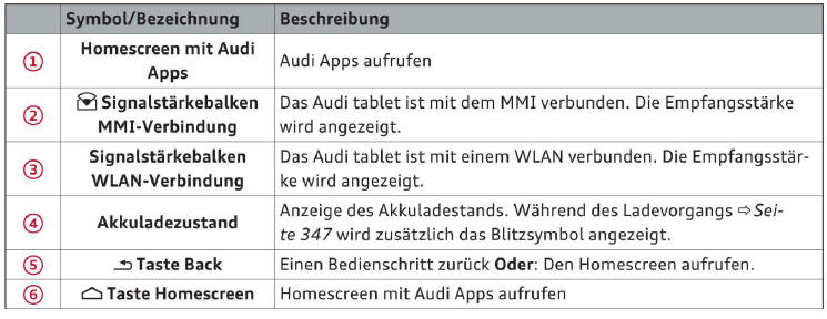 Abb. 301 Audi tablet: Prinzipdarstellung Menüs und Symbole