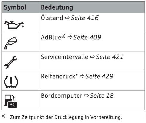 Abhängig von der Fahrzeugausstattung werden folgende Menüpunkte angezeigt: